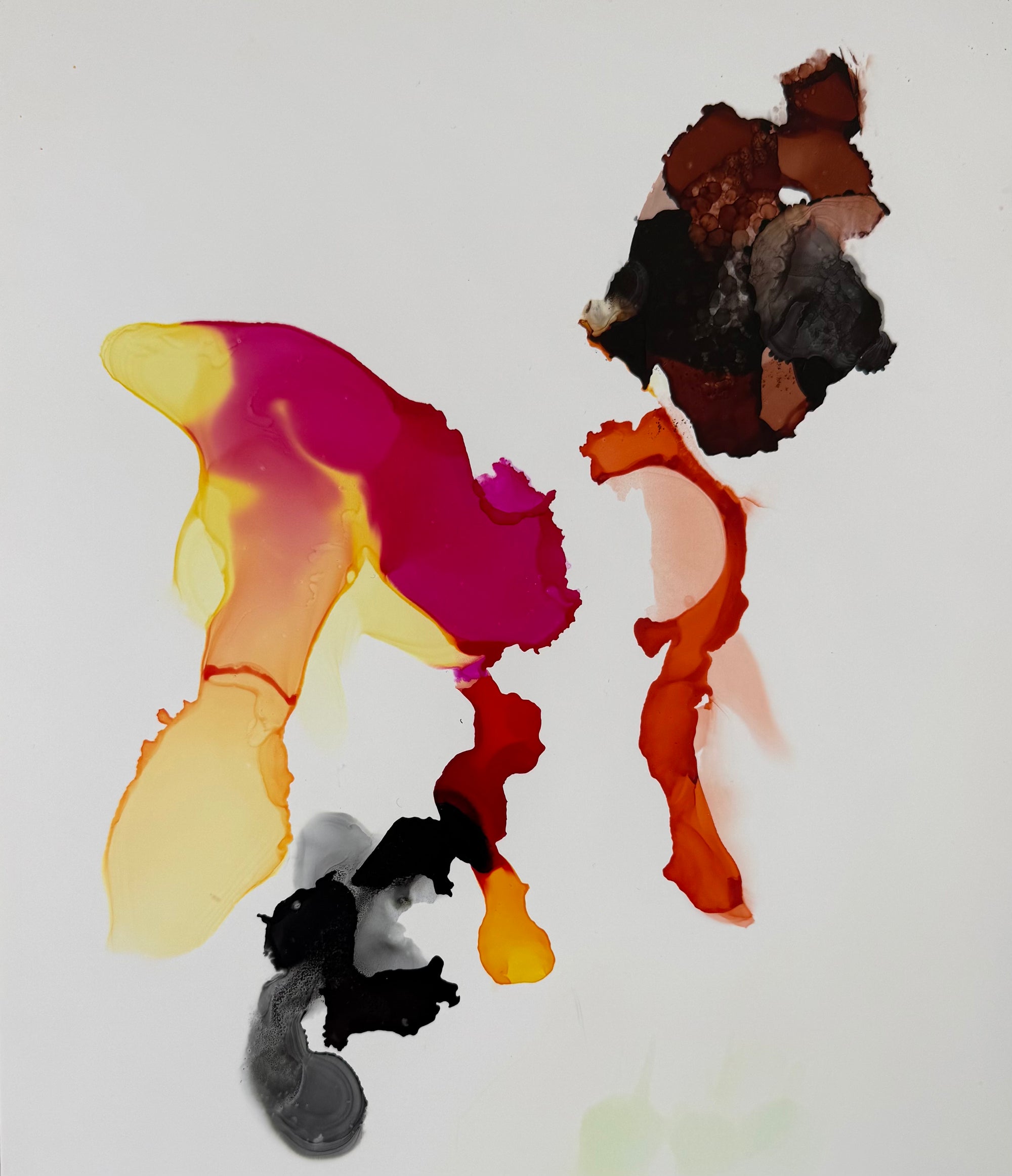 Her work unfolds in the charged space between control and surrender, where alcohol ink behaves as both substance and impulse. Color seeps, collides, and evaporates, leaving behind gestures that feel suspended in motion. Edges blur into atmosphere; density gives way to translucence. Each composition balances intention with chance, allowing material to assert its own logic. Rooted in the lineage of abstraction, the practice becomes a meditation on movement, saturation, and the quiet tension between structure and release.